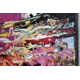 Use of Iridescent orange yellow, blue-green, precious gold, fluorescent and neon metallic paint add a juxtaposition of gloss and Matt interest.