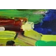 Brilliant colours create an even flowing movement, one covering and blending into the next, producing a pleasing flow of rainbow colours that help to calm and please the eye. Bold, big, bright slabs of colour applied in an abstract expressionist style creating harmony and sunny optimism. There is still the distinction between sky and land, with direction and style of brush strokes applied. A very large painting which will uplift and compliment any room or colour scheme. Sides painted.