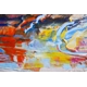 Brilliant colours create an even flowing movement that dances to rest at larger, less intensely space of larger shapes of colour. Bold, big, bright slabs of colour applied in an abstract expressionist style.
