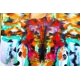 The abstract colours and shapes were deliberately chosen for each portrait's colour, shape and design- i.e. in Queen Elizabeth portrait the Union Jack is used, but I did not want a dark blue so used a pearlescent light blue teal so that it would not to clash with the red. Another recurring feature is only the flesh parts of the portraits are painted in oils and not abstracted. In this particular painting, pearl white 3D dots are used as jewels.