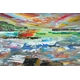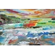 and yellows. Thickly applied and textured on stretched canvas. A large and abstracted seance with distant green lands and march with near rivers and cascading blue waves.