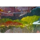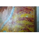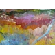 Beautiful colourful painting with bright oranges, reds and pinks and yellows. Thickly applied and textured on stretched canvas. A beautifully abstracted seance with dramatic colourful skies. Pure abstract painting where only skies and land meet, nothing else to take away the view and pure colour experience. Distant mountings rivers and trees are quickly and skilfully scraped out of wet paint, revealing highlights and giving depth to the picture.