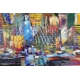 This colourful and textured painting has a unique dimensional quality achieved by the artist observation of architectural juxtaposition of colourful abstract shapes and forms. Tall skyscrapers reflections on glass, innovative materials and build techniques. Famous new and old landmarks form shapes with character names. Textured blocks of colours and tones interplay to produce an attractive view of New Yorks evolving skyline.