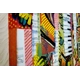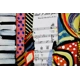 Colourful and textured planes of colour in juxtaposition with mixed media. Newspaper thought-provoking hidden words, rock-on, passion-play, and fabulous are adjectivally intermingled in a cubist manner with musical score, And I love you so.