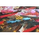 Use of Iridescent orange yellow, blue-green, precious gold, fluorescent and neon metallic paint add a juxtaposition of gloss and Matt interest.