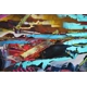 Brilliant colours create an even flowing movement that dances to rest at larger, less intensely space of larger shapes of colour. Bold, big, bright slabs of colour applied in an abstract expressionist style.