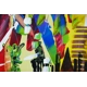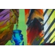 This colourful and textured painting has a unique dimensional quality achieved by the artist observation of architectural juxtaposition of colourful abstract shapes and forms. Tall skyscrapers reflections on glass, innovative materials and build techniques. Famous new and old landmarks form shapes with character humorous names. Walkie Talkie, Gherkin, The Scalpel, City Hall, Darth Vader's Helmet, London Eye, The Cheese grater, The Shard, Westminster, Tower Bridge, St. Paul's, and more. Textured blocks of colours and tones interplay to produce an attractive view of London's evolving skyline.